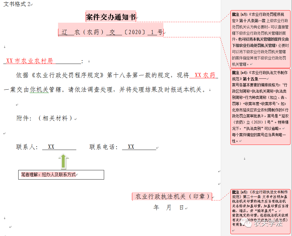 1.关于案号。辖区案件交办情况较少的,可根据《农业执法文书制作规范》第15条的规定,即特殊情况下,“执法类别”可以省略。